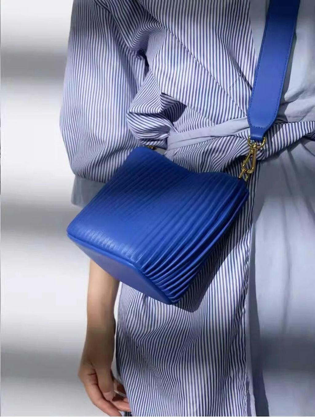 A sculptural take on the classic bucket bag, the Waves is a statement of texture and movement. Crafted from split leather, which is created by splitting full-grain or top-grain cowhide into multiple layers., its structured pleats create a mesmerizing play of light and shadow, making it as much an art piece as an everyday essential. The spacious interior, lined with soft microfiber, offers ample room for your essentials, while the magnetic closure keeps everything secure. Designed to be carried effortlessly, whether as a shoulder or crossbody bag, with its removable 50cm leather strap.